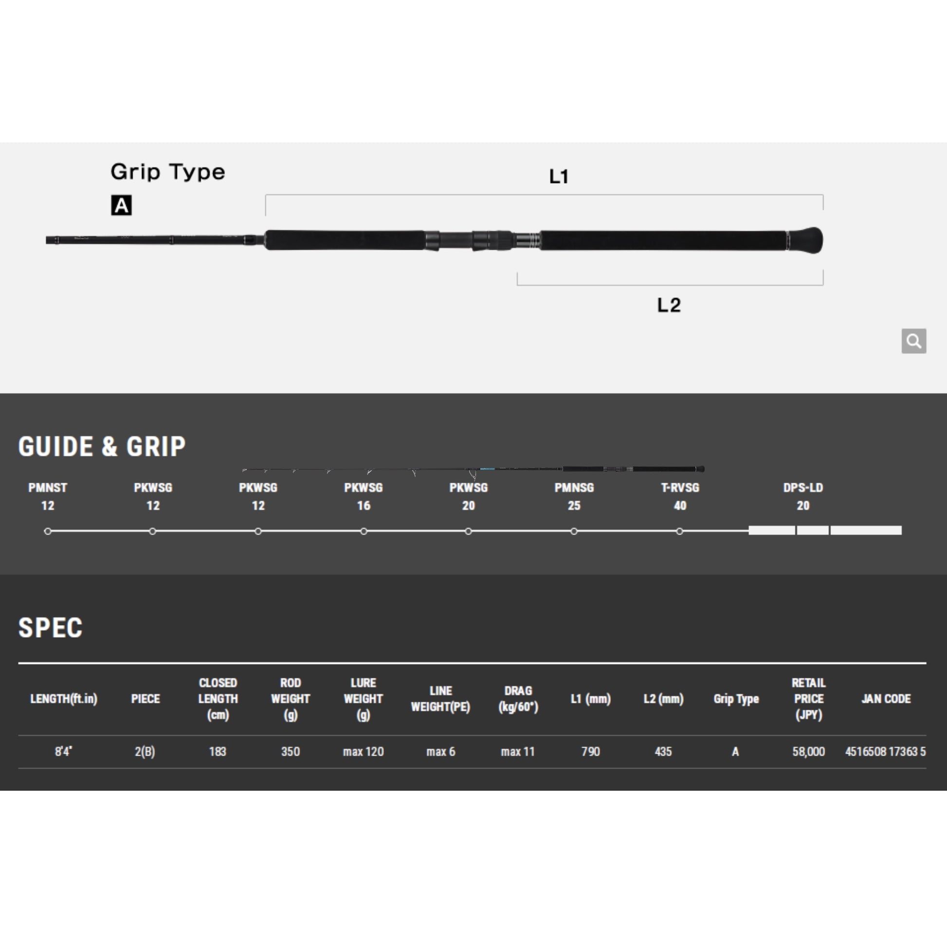 This rod was designed with a thorough pursuit of a comfortable casting feel, allowing anglers to accurately cast their lure into a far-off spot at that exact moment. By using Toray's Torayca® T1100G blank material, the rod achieves significant weight reduction while maintaining breaking strength. The butt guide is equipped with a Fuji T-RVSG, which boasts smooth line release, further boosting casting distance. This model allows for consistent, high-precision casting throughout the day. It's well-suited for a wide range of big game, including tuna, GT, yellowtail, and amberjack.